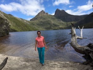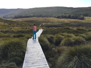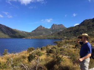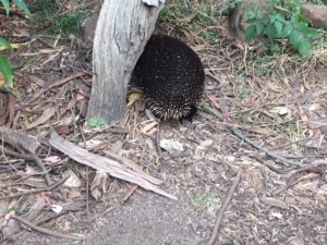 Am frühen Nachmittag sind wir dann im Cradle Mountain Wilderness Village angekommen und haben unser Cottage bezogen. Das Auto haben wir stehen lassen und nehmen dafür den kleinen Shuttle Bus (ist im National Park Pass inkl.). Er fährt an mehreren Wanderausgangspunkten vorbei. Autos sind nur mit Bewilligung zugelassen. Wir wandern um den Lake Dove mit Sicht auf den Cradle Mountain und dann noch eine gute Stunde bis zum Ronny Creek weiter. Weil es schon gegen Abend zugeht, haben wir Glück und können den Wombats beim Grasen zusehen. Auch ein stachliges Tierchen haben wir gesehen und wissen, Trowunna Wildlife Park sei dank, dass es ein Echidna ist.